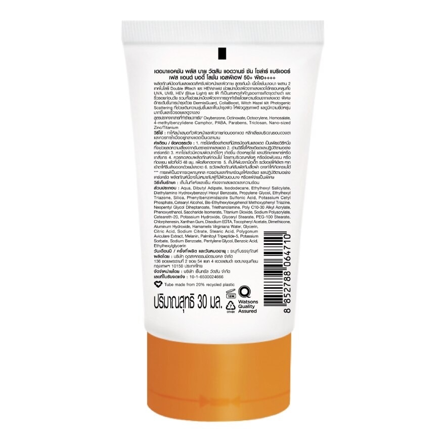 This lightweight face and body lotion with water resistant formula is a broad spectrum sunscreen to protect the skin from harmful rays, namely UVA, UVB, HEV (Blue Light) and IR rays, the major causes of dark spots, skin damage and premature ageing. Reef safe formula is free from Oxybenzone, Octinoxate, Octocrylene, Homosalate, 4-methylbenzylidene Camphor, PABA, Parabens, Triclosan, Nano-sized Zinc/Titanium bull; Double IRtech synergises the two technologies of Elix-IR and UV-IR Block DTCP to maximise IR photoageing protection, improve skin firmness and elasticity, and minimise damage from UV and IR rays. bull; HEVshield works as a coating film to protect your skin from UV rays and High Energy Visible Light, which damage the skin, trigger premature signs of ageing and cause uneven skin tone and skin damage. bull; DermisGuard strengthens the skin barrier function and provides deep hydration for the skin. bull; CollaBoost helps promote skin elasticity and reduce the appearance of wrinkles. bull; Witch Hazel Extract has antioxidant properties to protect your skin from pollution, tighten pores and control oil. bull; Photogenic Scattering helps reflect light, making your skin look bright and radiant. Our products is sustainable Choices product. Tube made from 25 recycled plastic.