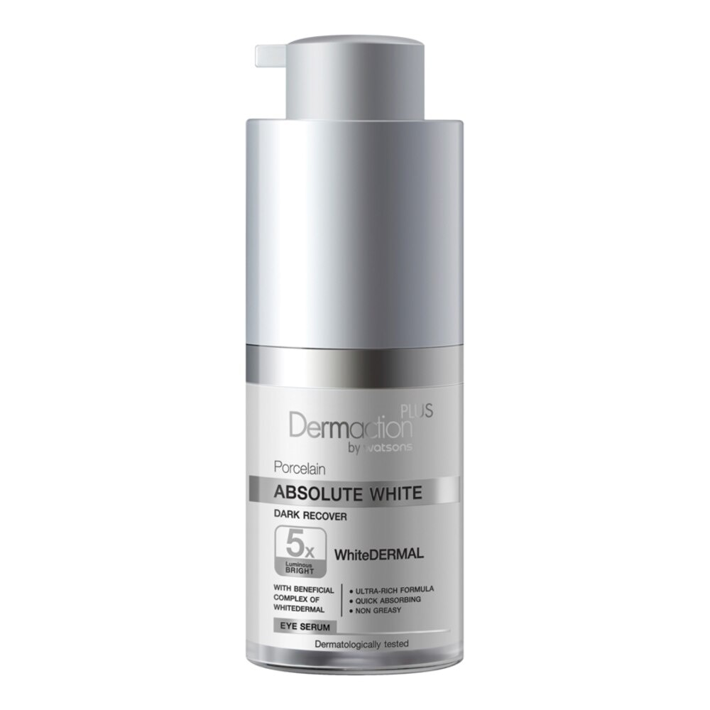 This dark recover eye serum is specially formulated to whiten and brighten the dark areas around the eyes. WhiteDermal is a combination of natural extract, Vitamin C, and Vitamin B3 to improve skin uniformity and luminosity, and promote collagen synthesis. Moist SR 3D Technology offers powerful anti-thirst moisturisation by adding and locking moisture into your skin to prevent skin dryness. Actosome Whitenol is a unique nano-liposome which penetrates deep inside your skin to help reveal brighter, more radiant skin. EyeSolveTM helps diminish eyes bags, and rejuvenate and brighten your eye areas. Vitamin A provides antioxidising effect and moisturises skin around the delicate eye area.* Use in conjunction with other products in the Dermaction Plus by Watsons Porcelain Absolute White range.