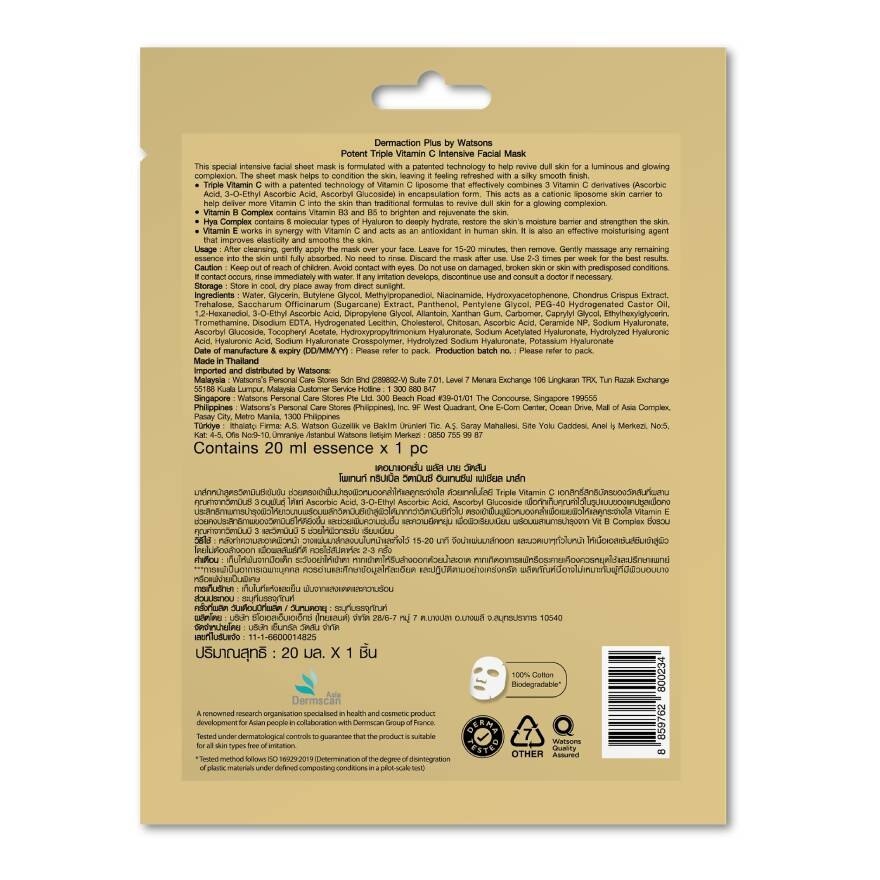 This special intensive facial sheet mask is formulated with a patented technology to help revive dull skin for a luminous and glowing complexion. The sheet mask helps to condition the skin, leaving it feeling refreshed with a silky smooth finish. (Triple Vitamin C) with a patented technology of Vitamin C liposome that effectively combines 3 Vitamin C derivatives (Ascorbic Acid, 3-0-Ethyl Ascorbic Acid, Ascorbyl Glucoside) in encapsulation form. This acts as a cationic liposome skin carrier to help deliver more Vitamin C into the skin than traditional formulas to revive dull skin for a glowing complexion. (Vitamin B Complex) contains Vitamin B3 and B5 to brighten and rejuvenate the skin. (Hya Complex) contains 8 molecular types of Hyaluron to deeply hydrate, restore the skin’s moisture barrier and strengthen the skin. (Vitamin E) works in synergy with Vitamin C and acts as an antioxidant in human skin. It is also an effective moisturising agent that improves elasticity and smooths the skin.