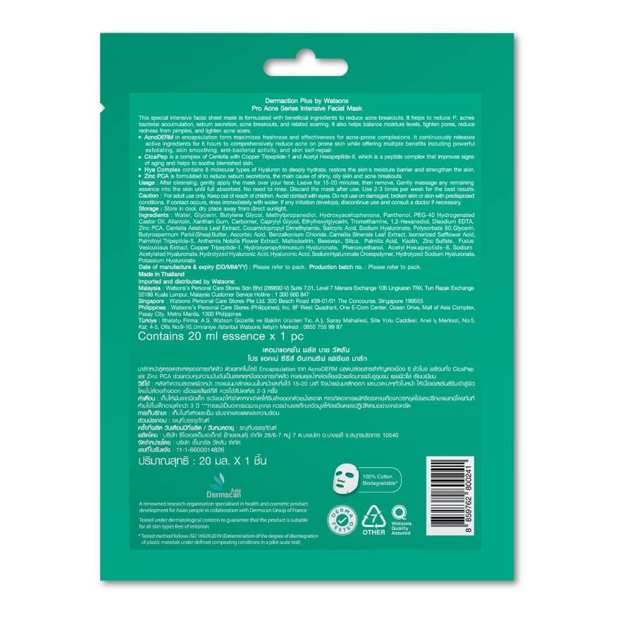 A synergised technology of AcnoDERM and CicaPep provides a comprehensive anti-acne solution for acne-prone skin and helps to fix blemishes and restore a clearer complexion This special intensive facial sheet mask is formulated with beneficial ingredients to reduce acne breakouts. It helps to reduce C. acnes bacterial accumulation, sebum secretion, acne breakouts, and related scarring. It also helps balance moisture levels, tighten pores, reduce redness from pimples, and lighten acne scars. (AcnoDERM) in encapsulation form maximizes freshness and effectiveness for acne-prone complexions. It continuously releases active ingredients for 6 hours to comprehensively reduce acne on prone skin while offering multiple benefits including powerful exfoliating, skin smoothing, anti-bacterial activity, and skin self-repair. (CicaPep) is a complex of Centella with Copper Tripeptide-1 and Acetyl Hexapeptide-8, which is a peptide complex that improves signs of aging and helps to soothe blemished skin. (Hya Complex) contains 8 molecular types of Hyaluron to deeply hydrate, restore the skin’s moisture barrier and strengthen the skin. (Zinc PCA) is formulated to reduce sebum secretions, the main cause of shiny, oily skin and acne breakouts.