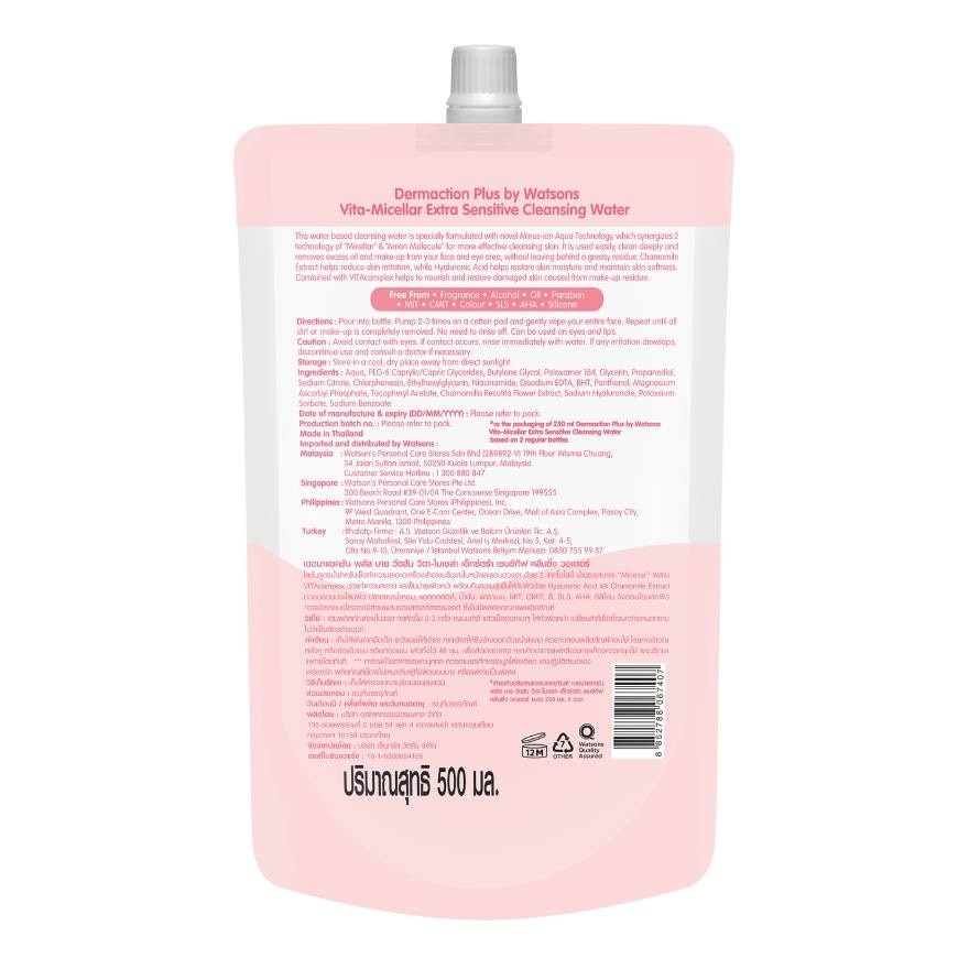 Dermaction Plus by Watsons Vita-Micellar Extra Sensitive Cleansing Water. This water based cleansing water is specially formulated with novel Minus-ion Aqua Technology, which synergizes 2 technology of quot;Micellarquot; amp; quot;Anion Moleculequot; for more effective cleansing skin. It is used easily, clean deeply and removes excess oil and make-up from your face and eye area, without leaving behind a greasy residue. Chamomile Extract helps reduce skin irritation, while Hyaluronic Acid helps restore skin moisture and maintain skin softness. Combined with VITAcomplex helps to nourish and restore damaged skin caused from make-up residue. Ingredient you can trust with a reduced environmental impact. This product was formulated without over 20 unwanted ingredients. The use of this refill pack helps reducing packaging waste.