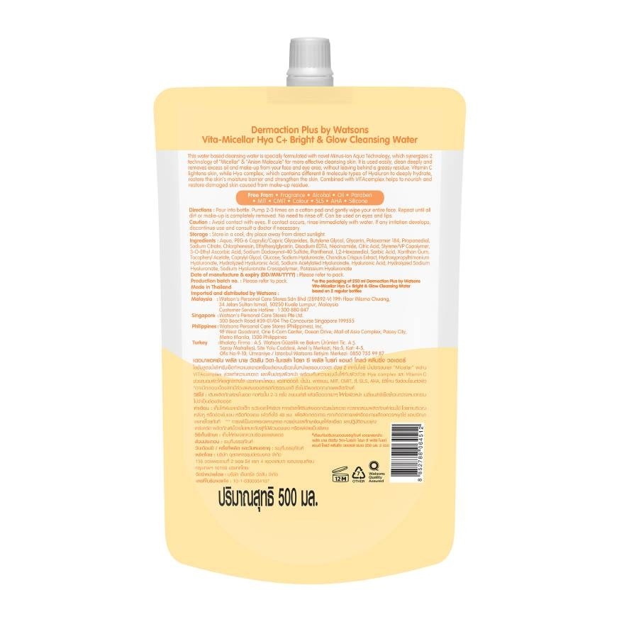 Dermaction Plus by Watsons Vita-Micellar Hya C+ Bright amp; Glow Cleansing Water. This water based cleansing water is specially formulated with novel Minus-ion Aqua Technology, which synergizes 2 technology of quot;for more effective cleansing skin. It is used easily, clean deeply and removes excess oil and make-up from your face and eye area, without leaving behind a greasy residue. Vitamin C lightens skin, while Hya complex, which contains different 8 molecule types of Hyaluron to deeply hydrate, restore the skin's moisture barrier and strengthen the skin. Combined with VITAcomplex helps to nourish and restore damaged skin caused from make-up residue. Ingredient you can trust with a reduced environmental impact. This product was formulated without over 20 unwanted ingredients. The use of this refill pack helps reducing packaging waste.