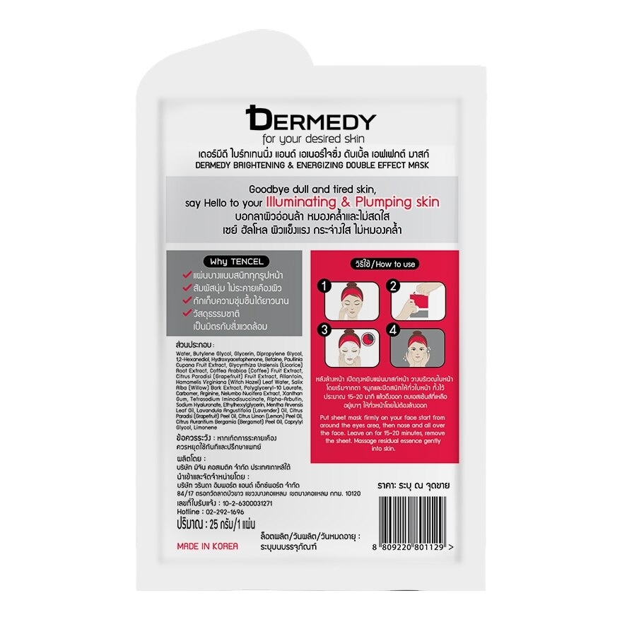 Dermedy Brightening & Energizing Double Effect Mask 1’s Goodbye dull and tired skin, Say Hello to your Illuminayting & Plumping skin. Grapefruit — brighten up skin tone and keep skin moist Arbutin — reduce melanine generating, skin even tone Guarana — strengthen skin barier for healthier skin Coffee berry — energize skin to be refresh and brighten