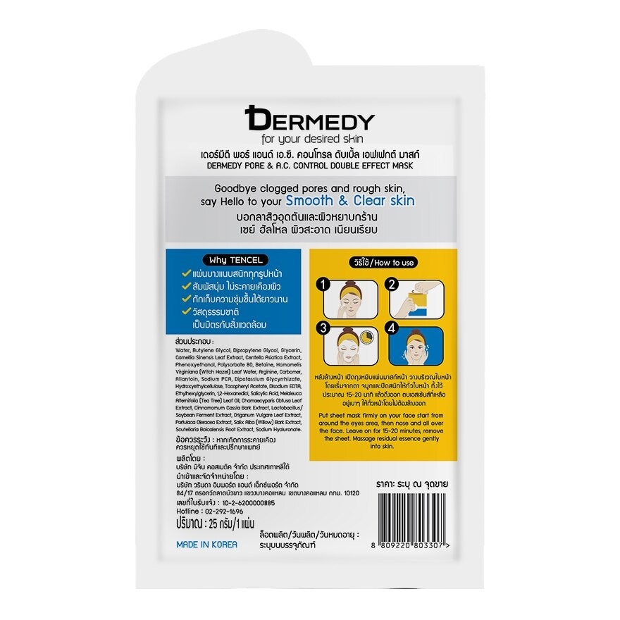 “Dermedy Pore & A.C. Control Double Effect Mask”, a pore minimizing and acne control facial mask. Witch Hazel and Green Tea are excellent absorbing properties and remove impurities. Willow Bark, Tea Tree Oil, Salicylic acid and Hinoki Leaf Extract minimize pores and improve skin revitalized for skin becoming soft and silky touch. Suitable for clogged and enlarged pore, keeping the skin toned and clear.