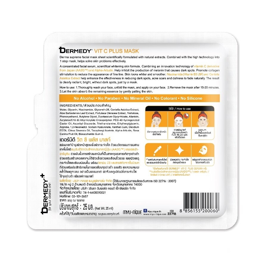 Dermedy Vit C Plus Mask Derma supreme facial mask sheet scientifically formulated with natural extracts. Combined with the high technology into 1 step mask, helps solve skin problems effectively. A concentrated facial mask sheet, scientifical whitening skin formula. With innovation combining technology of vitamin C derivative from Japan (AA2G) and Alpha-arbutin. Help inhibit the production of melanin that causes dark spots. Promotes collagen stimulation to reduce the appearance of fine line. Skin looks whiter and smoother. Niacinamide (vitamin B3) and Centella asiatica extract helps enhance the effectiveness in reducing dark spots, acne scars and dullness to fade naturally. The result is clearly radiant, bright, without dark spots, just by the mask.