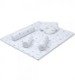 В комплект входит матрасик (120х60 см, толщиной 3 см), фиксатор, мини-валик и две подушки: круглая и прямоугольная.