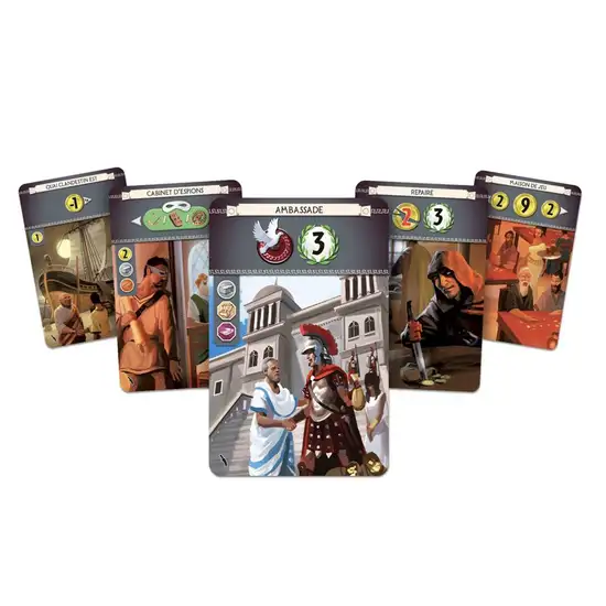 In the dark alleyways of your city, gold changes hands, alliances are made and secrets are betrayed… Now your influence extends to the heart of rival cities. But take care, their spies plot within your walls! In addition to two new Wonders and the ability to play in teams, this expansion offers you a new type of cards: Cities. Mercenaries, thieves, spies, and diplomats will give new interactions in your games.