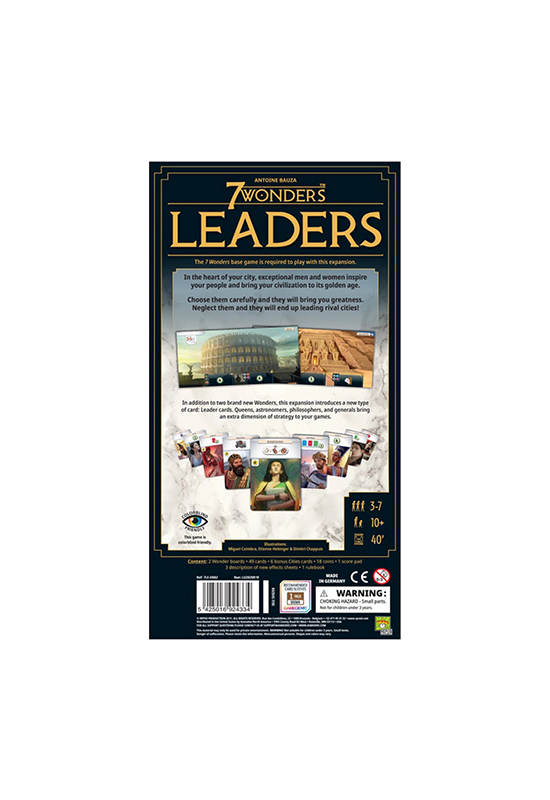 At the heart of your city, exceptional men and women inspire your people and lead your civilization to its apogee. Choose them with care and they will contribute to your greatness. Neglect them and they will end up at the head of rival cities! In addition to two new Wonders, this expansion offers you a new type of card: Leader cards. Queens, astronomers, philosophers, and generals will all bring extra strategic dimensions to your games.