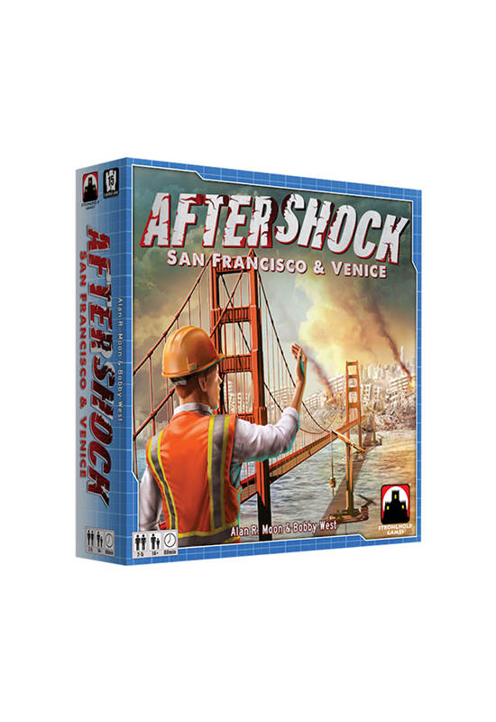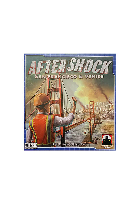 Aftershock: San Francisco & Venice is an area control game. Players will spend money to acquire cards, which are used to increase population, build bridges, and determine where aftershocks occur. Negotiate with other players to score areas on the placement board.
