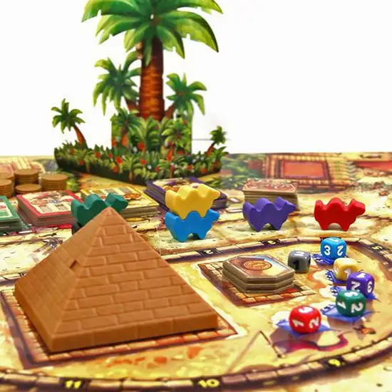 In Camel Up, up to eight players bet on five racing camels, trying to suss out which ones will place first and second in a quick race around a pyramid. The earlier you place your bet, the more you can win — should you guess correctly, of course. Camels don’t run neatly, however, sometimes landing on top of another one and being carried toward the finish line. Who’s going to run when? That all depends on how the dice come out of the pyramid dice shaker, which releases one die at a time when players pause from their bets long enough to see who’s actually moving!