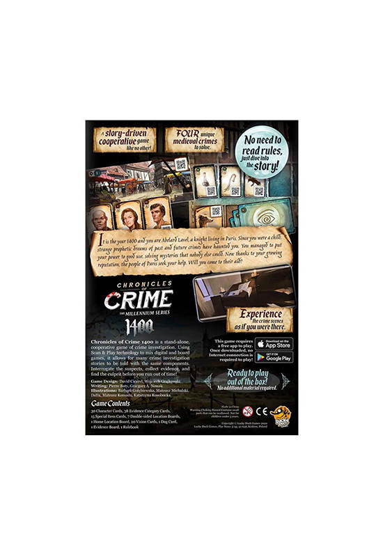 The Chronicles of Crime: 1400 standalone game brings back well-known mechanisms of the original Chronicles of Crime game while adding some new twists. Now you can deduce not only from the evidence you find or the testimonies given by various characters but also from the mysterious scenes depicted on new Vision Cards. These scenes can be either from the future or from the past and they usually involve characters and objects yet to be revealed.