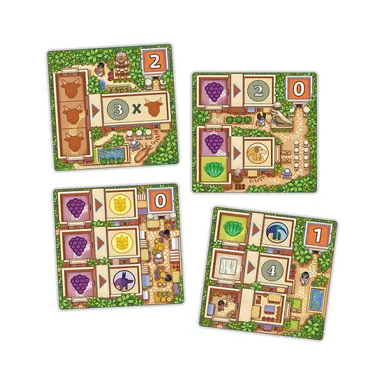 A player’s turn goes through three fast and simple steps. They start by placing one of their Valley tile on the central board in order to collect resources : alabaster, bovines, papyrus flowers, grapes or wheat. They then have the opportunity to spend these resources to build a new District tile on their Metropolis board, for opening new opportunities. Lastly, they supply their Shops in their Metropolis by stocking the remaining resources. Any resource that a player has left unused at the end of their turn is lost. So, the aim is to collect as many resources as possible, but even more to be able to optimize how to use them. The game ends after 9 turns and each totally supplied Shop is worth money for their owner. The player with the highest amount of money is the winner.