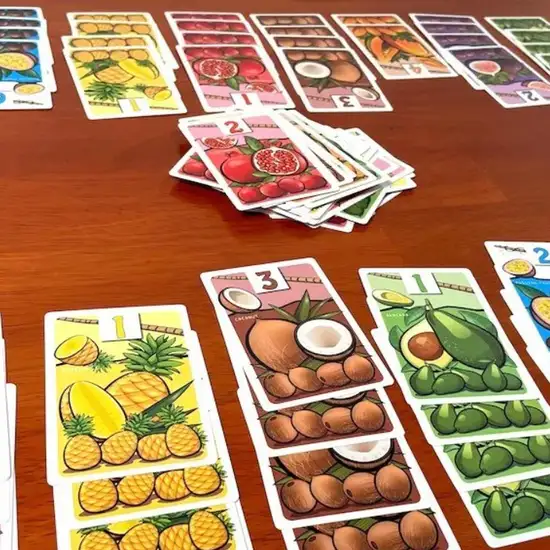 Players try to collect sequential numbers of each different type of fruit, but they can collect only one sequence of each type, so they can compile at most seven different sequences. You can collect these sequences in any order you like, but you cannot look at any of your cards once you have collected them. Your aim is to collect all five cards in sequence of coconuts, papayas, figs, avocados, pomegranates and pineapples (or all seven cards in the case of passion fruit), but don’t duplicate the numbers you collect or you won’t score anything!