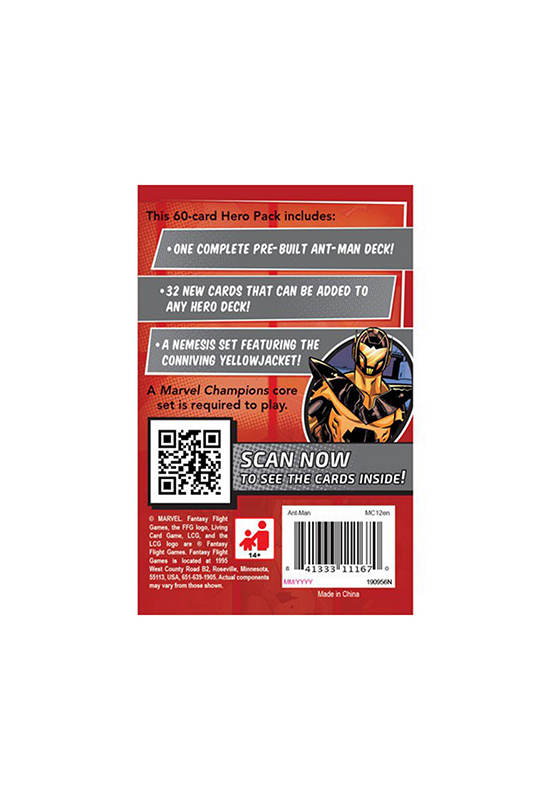 Changing size in the blink of an eye, from as small as an ant to as large as a giant, Ant-Man leaps into action in your games of Marvel Champions: The Card Game. As the first hero with two distinct hero forms—one Tiny and one Giant— Ant-Man is equipped to take down any threat. Within this Hero Pack, you’ll find Ant-Man, his fifteen signature cards, and a full assortment of Leadership cards inviting you to lead new allies into battle.