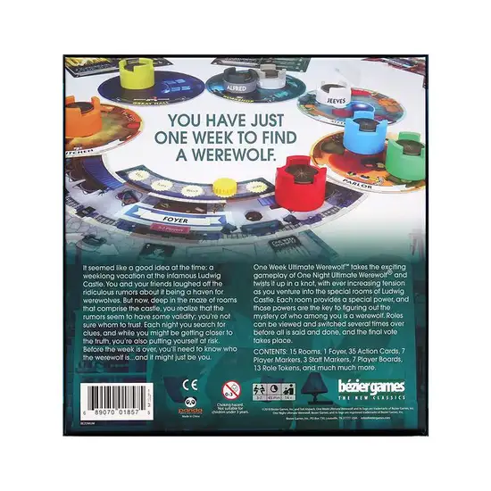 One Week Ultimate Werewolf takes the gameplay of One Night Ultimate Werewolf and twists it up in a knot, with ever-increasing tension as you venture into the special rooms of Ludwig Castle. Each room provides a special power, and those powers are the key to figuring out the mystery of who among you is a werewolf. Roles can be viewed and switched several times before all is said and done, then the final vote takes place.