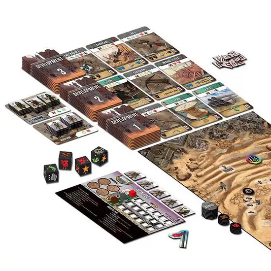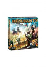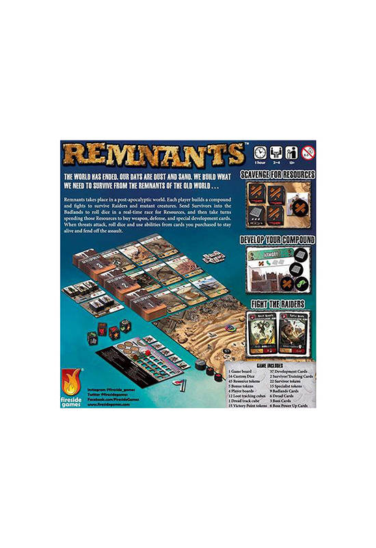 Remnants takes place in a post-apocalyptic world. Each player builds a compound and fights to survive raiders and mutant creatures. The game is played in five phases: Scavenge, Build, Fight, Heal, and Clean-up. In the Scavenge phase, you send survivors into the Badlands to roll dice in a real-time race for resources. In the Build phase, you take turns spending those resources to buy weapon, defense, and special development cards that enhance your compound. When threats attack, you roll dice and use abilities from cards you purchased to survive. You’ll fight a Level 1 threat, followed by a Level 2 threat, then finally face down the Raider Boss.