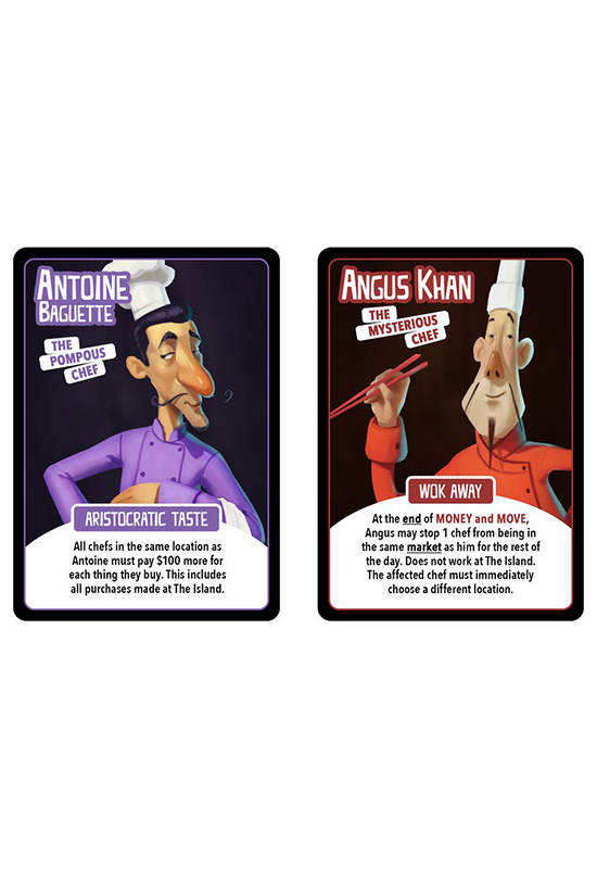 In addition, each player controls a chef equipped with their own «chef power». Chef powers are asymmetrical and allow players to bend the rules in their favor. The base game of Rival Restaurants has twelve chefs, and additionally, at the beginning of the game, each player must choose a restaurant to play, with each restaurant having a unique level-up structure with rewards for reaching 3, 7, and 12 popularity points. Lastly, players can also choose to buy «action cards», that is, development cards that are typically for one-time use.