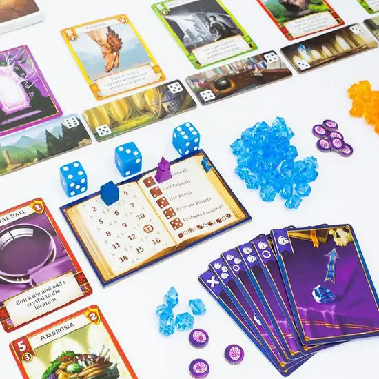 School of Sorcery is a two-player dice and area control game in which players use dice rolls to place «crystals» onto different cards in an attempt to win those cards. Once won, cards offer either special powers or victory points or both.