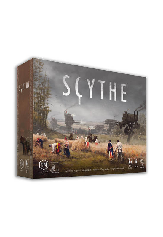 Scythe is an engine-building game set in an alternate-history 1920s period. It is a time of farming and war, broken hearts and rusted gears, innovation and valor. In Scythe, each player represents a character from one of five factions of Eastern Europe who are attempting to earn their fortune and claim their faction’s stake in the land around the mysterious Factory. Players conquer territory, enlist new recruits, reap resources, gain villagers, build structures, and activate monstrous mechs.