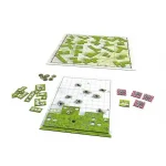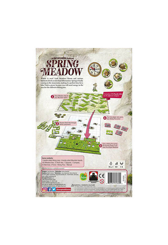 Place your meadow tiles with 0-2 holes skillfully on your mountain board to receive extra tiles when creating or expanding groups of holes. Find your way around the burrows of the marmots because they can restrict you during tile placement. Scoring takes place depending on the players’ selection of meadow tiles from a central game board. Whoever has the largest meadow during a scoring receives a hiking pin, and the first player to earn their second hiking pin during scoring wins.
