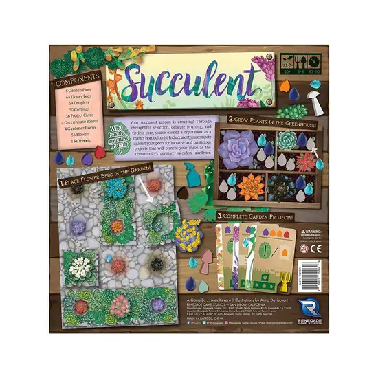 The game is played over a series of turns during which players collect succulent cuttings from their gardens along with water crystals and use them to complete projects which grant various benefits, including earning points. Most victory points at the end of the game wins!