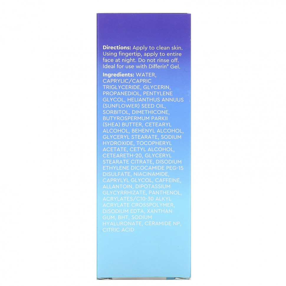 Этот питательный ночной увлажняющий крем питает и успокаивает грубую, шелушащуюся кожу. Восстанавливающее ночное увлажняющее средство, идеально подходящее для тех, кто использует гель Differin®, содержит масло ши, обеспечивающее постоянное увлажнение на протяжении всей ночи. Аллантоин и витамин Е питают кожу, которая к утру восстанавливает оптимальный баланс.
