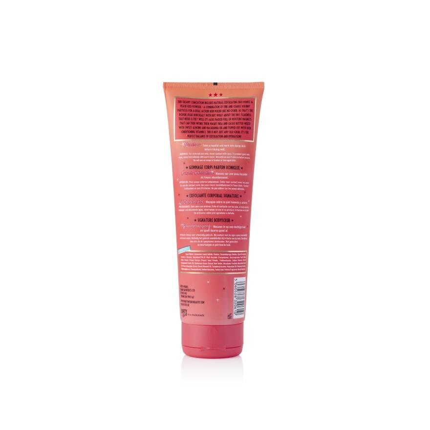 Dirty Works Lovely Scrubbly Body Scrub 250ml will add a touch of glamour to your daily selfcare routine. Dry skin does not stand a chance with our super moisturizing Dirty Works Lovely Scrubbly Body Scrub, a perfect balance of hydration and exfoliation. Natural exfoliants Pumice and Peach Seed Powder gently scrub you down while moisture magnets Shea Butter, Vitamin E and Sweet Almond Oil smooth and condition skin after every use. Its a luxuriously creamy concoction and helps tackle dry skin. Ideal for prepping your skin before applying fake tan or shaving as it whisks away all the tough skin and dry patches to ensure a flawless application and close shave. Infused with our long lasting Signature Scent for silky-smooth skin that smells heavenly. Experience the serenity of the spa at home with our Body Scrubs. Lovely Scrubbly is gentle enough to use a couple of times a week. Signature Scent fragrance notes Top Cassis, Bergamot, Peach. Middle Rose, Jasmine, Neroli, Freesia. Base Vanilla, Patchouli, Sandalwood, Tonka Bean