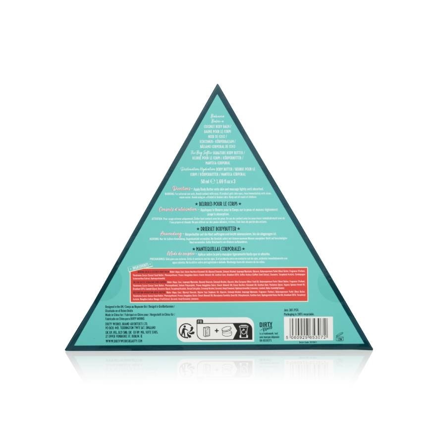 Dirty Works Smooth Over Body Butter Trio offers fun, fabulous, and gorgeously fragrant gifts to treat your loved ones this festive season. Nourishing ingredients and stunning fragrances for the ultimate bathroom escapism. Includes 50ml The Big Softie Body Butter. 50ml Absofruity Fabulous Body Butter. 50ml Bahama Balm A Coconut Body Balm. Enriched with moisturising Shea Butter and Sweet Almond Oil, these sumptuously scented Body Butters in three of Dirty Works fragrances will leave your skin feeling smooth and butterfly beautiful.