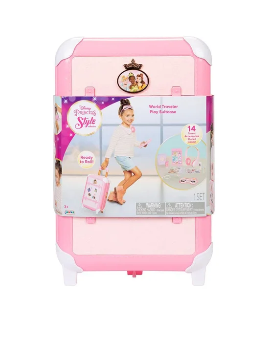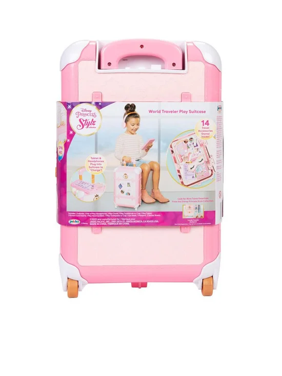 Toy suitcase from the brand DISNEY KIDDO. The World Traveler Play Suitcase stands over 14 inches high (without handle extended), with a refreshed stylish look to the outer-case, inspired by today’s high end luggage