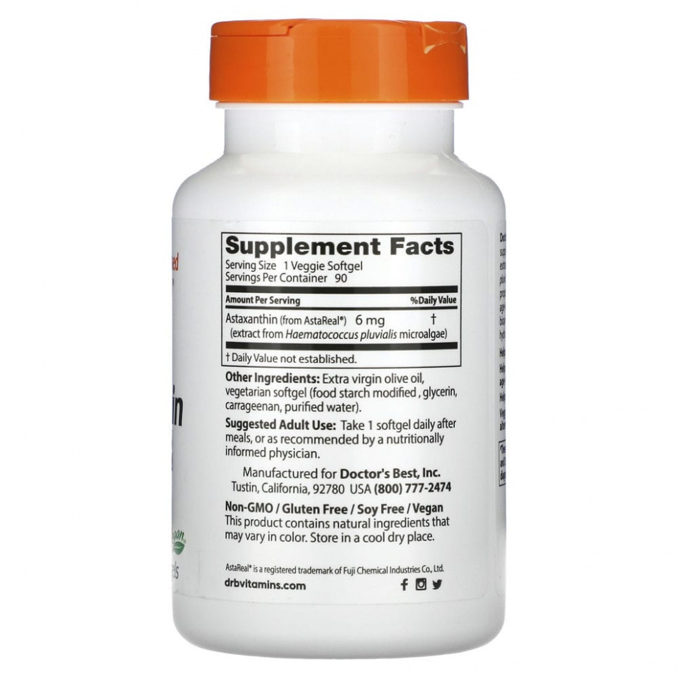 Астаксантин от Doctor’s Best с AstaReal® содержит натуральный астаксантин из экстрактов микроводорослей гематококк (Haematococcus pluvialis), не содержащих растворителей. Астаксантин обладает антиоксидантными свойствами, которые подавляют действие свободных радикалов и борются с возрастным окислительным стрессом. Это антиоксидант с высокой биодоступностью, который способствует увлажнению и эластичности кожи, поддерживает здоровье глаз.