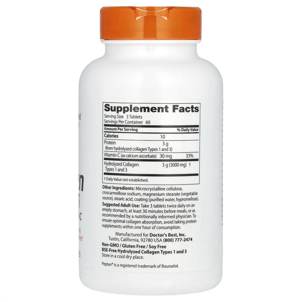 Коллаген типов 1 и 3 от Doctor’s Best содержит гидролизованный белок коллаген (без ГЭКРС), который способствует росту и здоровью тканей. Коллаген — это структурный белок, необходимый для прочности костей и гибкости суставов, сухожилий, связок, волос, кожи, ногтей и других тканей организма.
