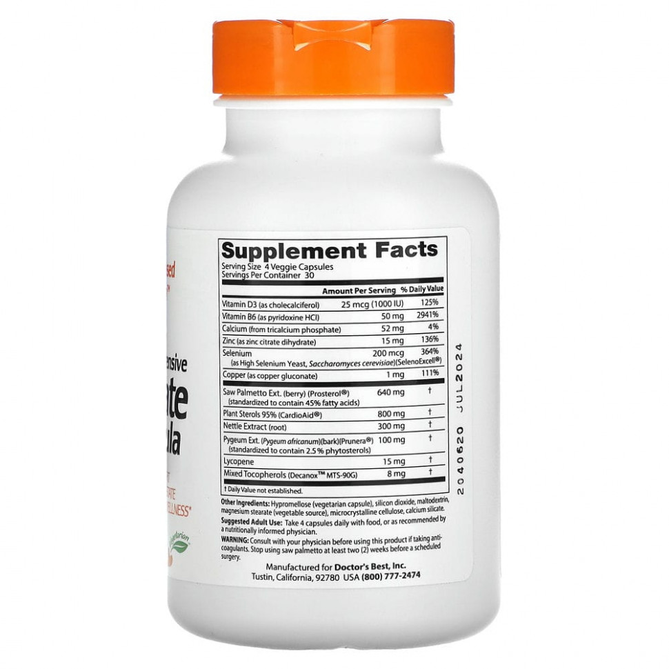 Комплексная формула для простаты от Doctor’s Best содержит эффективные уровни синергетических трав, питательных веществ и фитохимических веществ, которые, как было доказано научными исследованиями, поддерживают здоровье и хорошее самочувствие предстательной железы. Эта формула включает лучшие растительные экстракты пальмы серенои, коры африканского пигеума и корня крапивы, растительные стеролы CardioAid ™ и дрожжи с высоким содержанием селена SelenoExcell®, превосходную форму минерального селена, питательных веществ, которые доказали свою пользу для здоровья простаты.