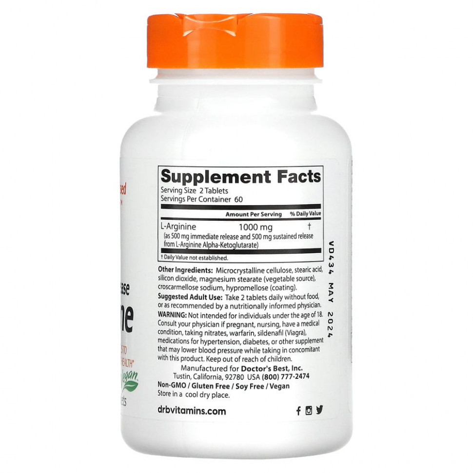 L-аргинин длительного и быстрого высвобождения от Doctor’s Best содержит эту незаменимую аминокислоту в двухслойной таблетке. В двух таблетках содержится 500 мг длительного высвобождения и 500 мг быстрого высвобождения L-аргинина в формуле, которая учитывает повышенные уровни этого питательного вещества в крови. L-аргинин с быстрым и длительным высвобождением изготавливается таким образом, чтобы за короткое время увеличить уровни L-аргинина в крови, а затем сохранить этот положительный рост в течение 8-часового периода.