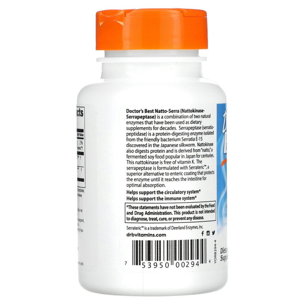Natto-Serra от Doctor’s Best — это сочетание двух натуральных ферментов, которые использовались в качестве пищевых добавок на протяжении нескольких десятилетий. Серрапептаза (серратио-пептидаза) представляет собой фермент для переваривания белков, выделяемый из полезной бактерии Serratia E-15, которая обнаружена в японском тутовом шелкопряде. Наттокиназа также способствует перевариванию белков и выделяется из «натто», ферментированного соевого продукта, остающегося популярным в Японии на протяжении многих веков. Наттокиназа не содержит витамина K. В состав серрапептазы входит серратерик, являющийся превосходной альтернативой кишечнорастворимой оболочке и защищающий фермент до достижения им кишечника для оптимального усвоения.