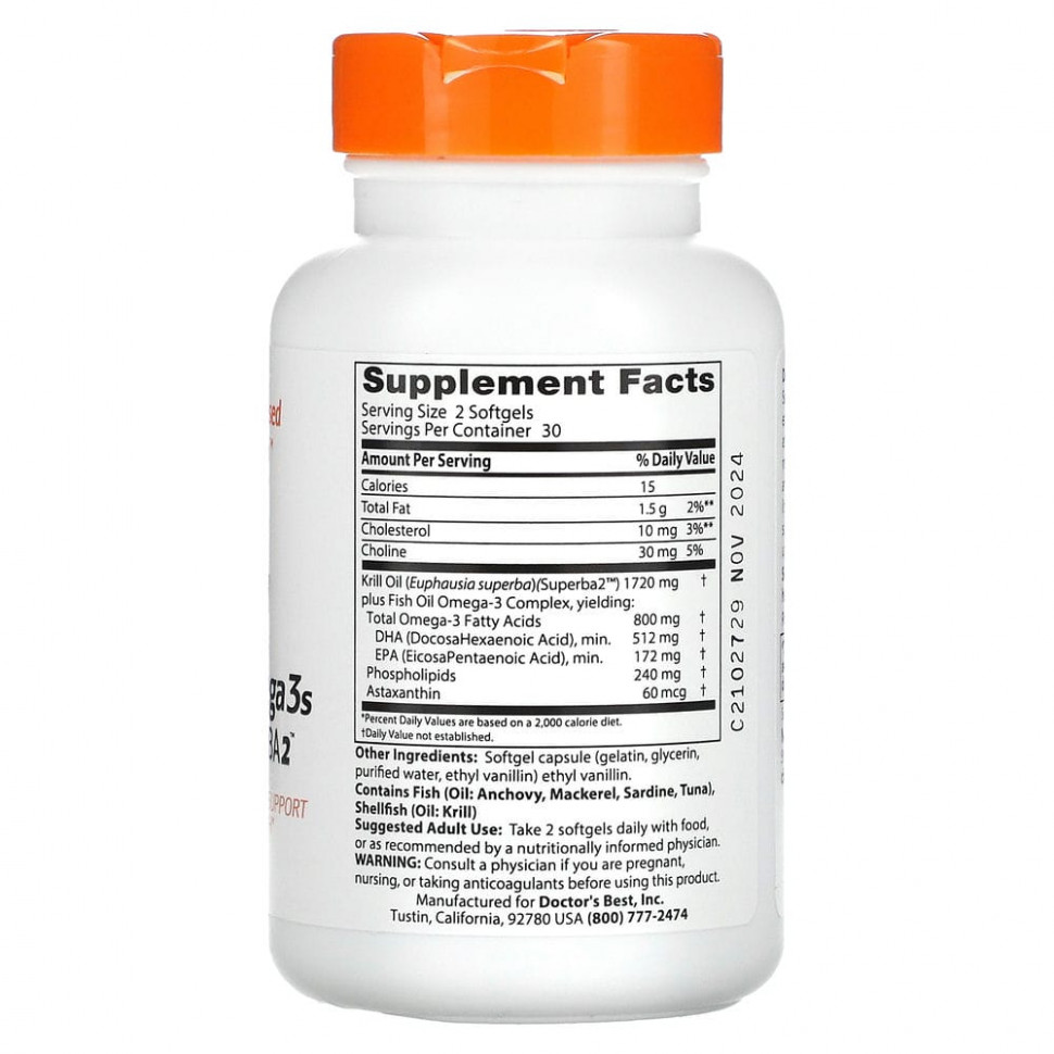 Криль от Doctor’s Best содержит природные фосфолипиды и астаксантин. Кроме того, мы добавили к нему ДГК (докозагексаеновая кислота) и ЭПК (эйкозапентаеновая кислота) омега-3. Жизненно важные липиды являются строительными блоками для систем клеточной мембраны, которые управляют важными жизненными функциями всех наших органов. Согласно исследованиям, чем больше омега-3 содержится в рационе, тем здоровее становится сердце. ДГК является наиболее распространенной жирной кислотой в мозге человека. Высокий уровень ДГК и фосфолипидов помогает поддерживать работу сердца и мозга. Фосфолипиды в жирных кислотах омега-3 легко смешиваются с желудочными жидкостями и оказывают щадящее воздействие на желудок.