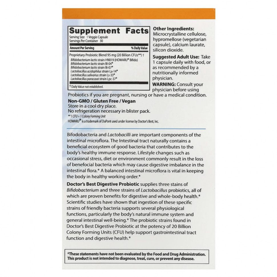 Пищеварительный пробиотик Doctor’s Best содержит три штамма бифидобактерий (Bifidobacterium) и три штамма лактобактерий (Lactobacillus), которые доказали свою пользу для здоровья пищеварительной системы и всего тела. Научные исследования показали, что употребление этих специфических штаммов полезных бактерий поддерживает несколько физиологических функций, в частности, естественную иммунную систему организма и общее состояние кишечника. Пробиотические штаммы с высокой клинической эффективностью в 20 миллиардов колониеобразующих единиц (КОЕ), содержащиеся в пищевом пробиотике Doctor’s Best, способствуют здоровой функции желудочно-кишечного тракта.