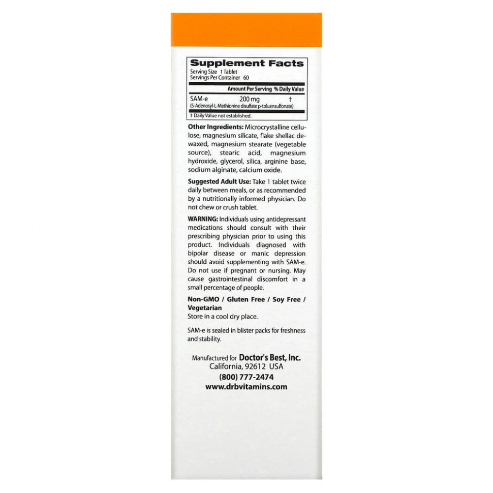 Doctor’s Best использует SAM-e высочайшего качества итальянской компании Soloesse®. SAM-e с медленным и направленным высвобождением улучшает усвоение и переносимость ЖКТ. Наш препарат SAM-e 200 содержит 200 мг активного SAM-e от Soloesse в каждой таблетке. Это служит гарантией того, что вы получаете самый эффективный препарат SAM-e с максимальным количеством активной S,S-формы на порцию.