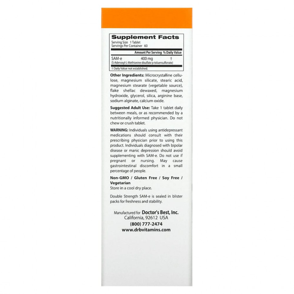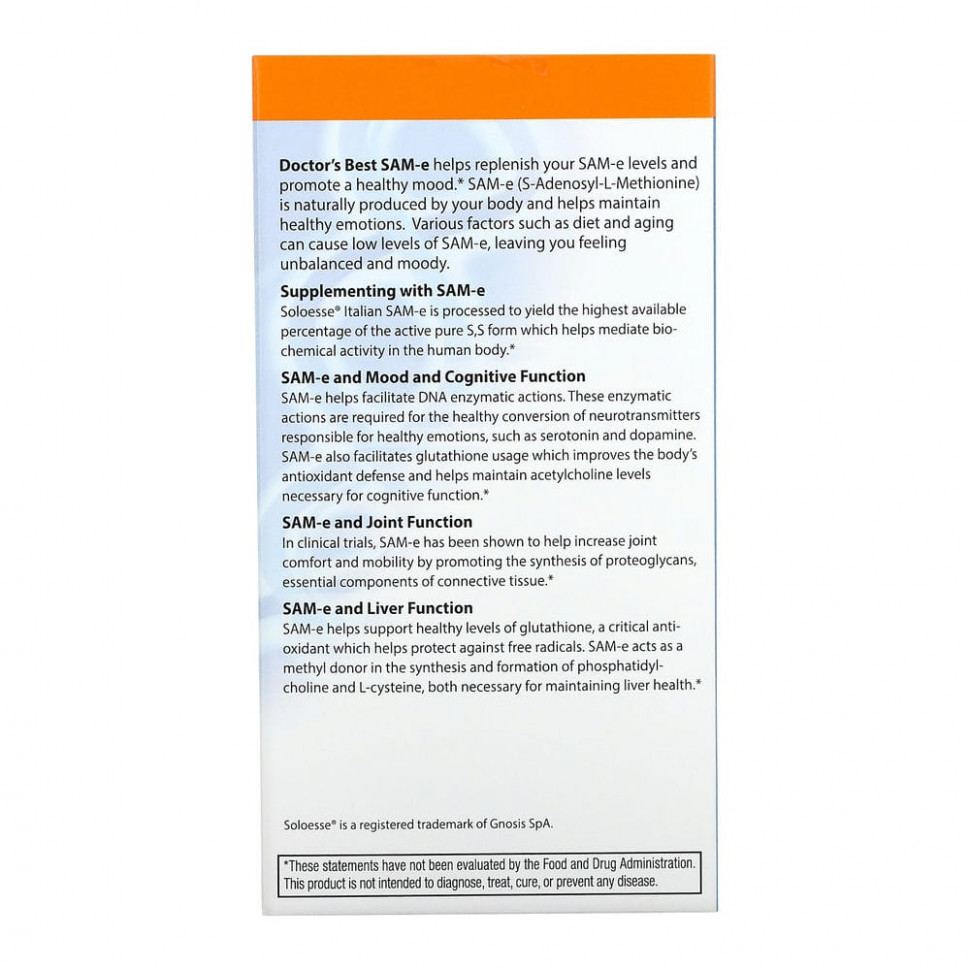 Doctor’s Best использует SAM-e высочайшего качества итальянской компании Soloesse. SAM-e с медленным и направленным высвобождением улучшает усвоение и переносимость ЖКТ. Наш препарат SAM-e 400 двойной силы содержит 400 мг активного SAM-e от Soloesse в каждой таблетке. Это служит гарантией того, что вы получаете самый эффективный препарат SAM-e с максимальным количеством активной S,S-формы на порцию.