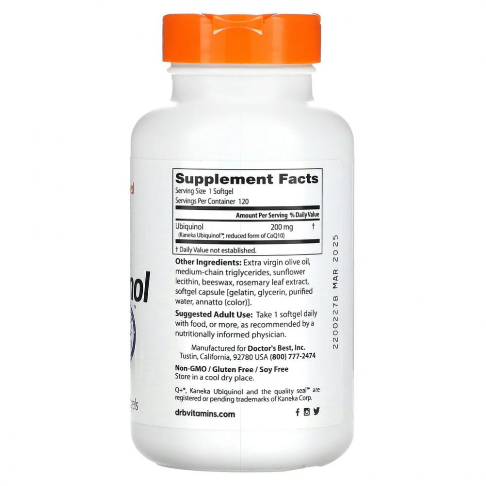 Убихинол от Doctor’s Best с Kaneka Ubiquinol™ содержит восстановленную форму коэнзима Q10. Как убихинол (CoQ10-H2), так и убихинон (CoQ10) являются метаболически активными веществами. Каждая форма играет уникальную роль в клетках, связанную с антиоксидантными действиями, поддерживающими здоровую работу сердца и повышающими выработку энергии. Убихинол способствует регенерации антиоксидантов, таких как витамины C и E. Он повышает биодоступность у пожилых людей, которые могут испытывать трудности с достижением высоких уровней этого питательного вещества или проблемы с усвоением питательных веществ.