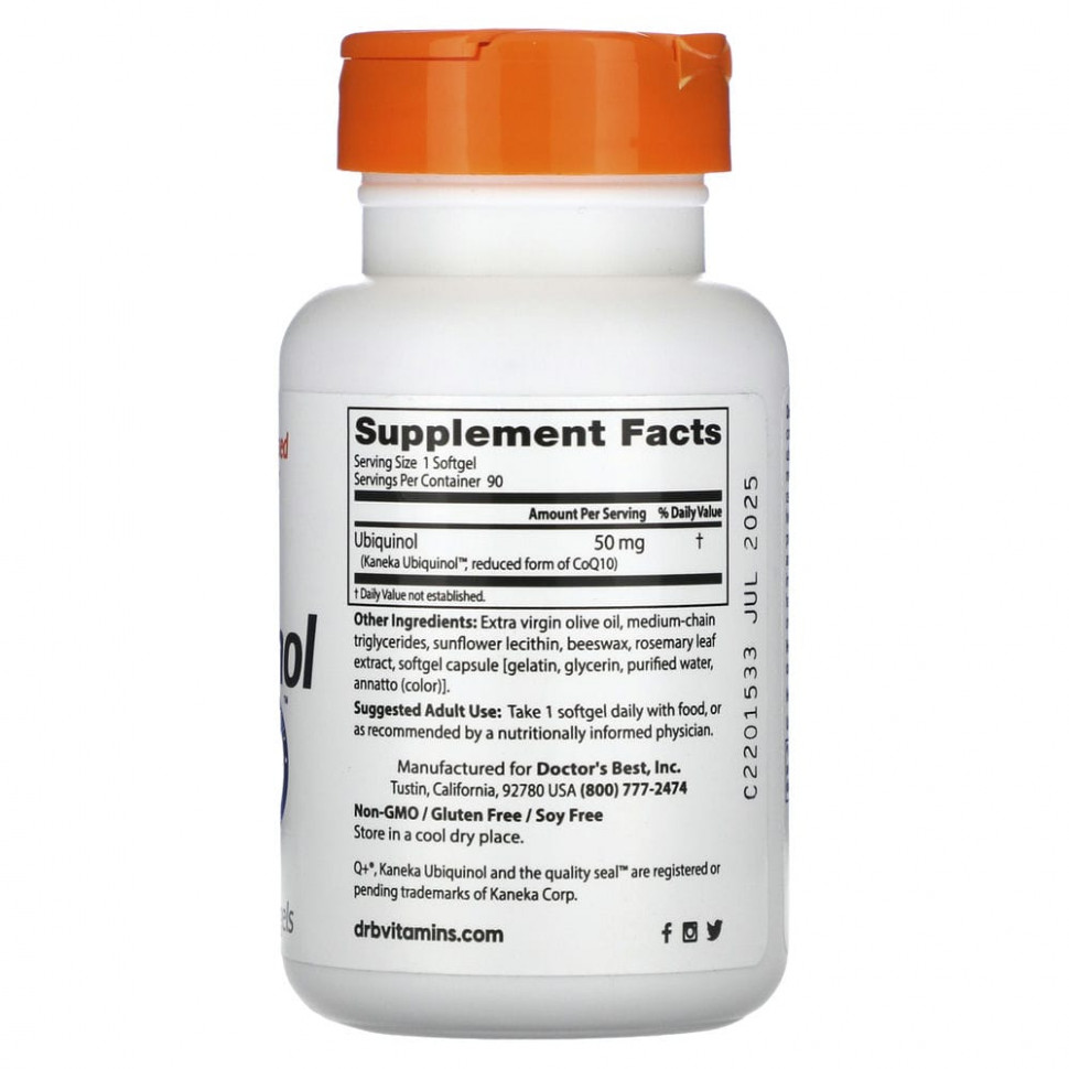 Убихинол от Doctor’s Best с Kaneka Ubiquinol™ содержит восстановленную форму коэнзима Q10. Как убихинол (CoQ10-H2), так и убихинон (CoQ10) являются метаболически активными веществами. Каждая форма играет уникальную роль в клетках, связанную с антиоксидантными действиями, поддерживающими здоровую работу сердца и повышающими выработку энергии. Убихинол способствует регенерации антиоксидантов, таких как витамины C и E. Он повышает биодоступность у пожилых людей, которые могут испытывать трудности с достижением высоких уровней этого питательного вещества или проблемы с усвоением питательных веществ.