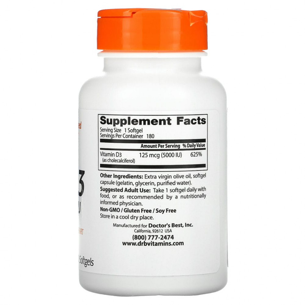 Витамин D3 от Doctor’s Best содержит D3 (в виде холекальциферола), необходимый организму для регулирования уровня фосфора и кальция, способствующих здоровью костей, зубов и сердца. Витамин D3 вырабатывается в коже за счет поглощения солнечных УФ-лучей и в ограниченных количествах поступает с пищей. Защита от солнца и климатические факторы могут влиять на низкий уровень витамина D3. Витамин D3 полезен для иммунной и сердечно-сосудистой систем, плотности и структуры костей, а также функционирования клеток. Он играет важную роль в работе большинства органов и систем организма и влияет на химические посредники иммунной системы.