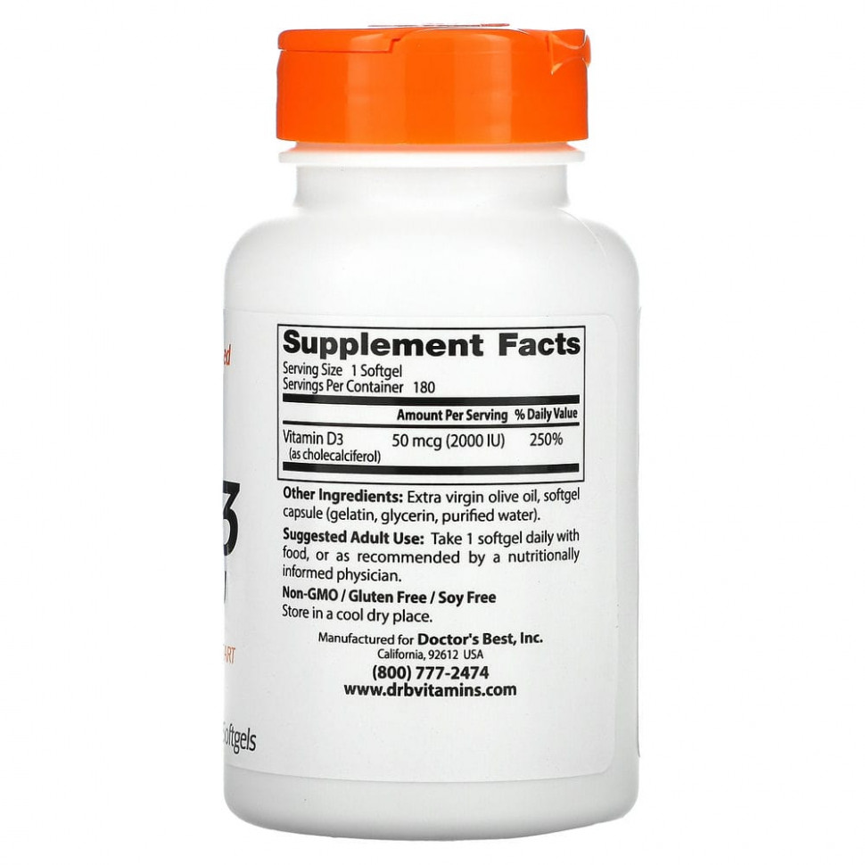 Витамин D3 от Doctor’s Best содержит D3 (в виде холекальциферола), необходимый организму для регулирования уровня фосфора и кальция, способствующих здоровью костей, зубов и сердца. Витамин D3 вырабатывается в коже за счет поглощения солнечных УФ-лучей и в ограниченных количествах поступает с пищей. Защита от солнца и климатические факторы могут влиять на низкий уровень витамина D3. Витамин D3 полезен для иммунной и сердечно-сосудистой систем, плотности и структуры костей, а также функционирования клеток. Он играет важную роль в работе большинства органов и систем организма и влияет на химические посредники иммунной системы.
