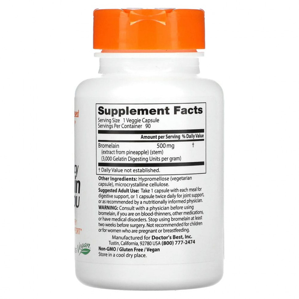 Бромелаин —это фермент, который получают из стеблей и плодов ананаса, обладающий протеолитическими свойствами (способствующий перевариванию белков). Бромелаин, содержащийся в продукте «Бромелаин 3000 GDU» от Doctor’s Best, является одной из самых мощных форм этого фермента, имеющихся на рынке. 3000 GDU относится к стандартизации ферментативной активности и отражает качество сырья, используемого в продукте. Бромелаин известен своими улучшающими пищеварение свойствами, а также оказывает благотворное системное действие на организм. Бромелаин также может поддерживать здоровье сердечно-сосудистой системы и суставов.