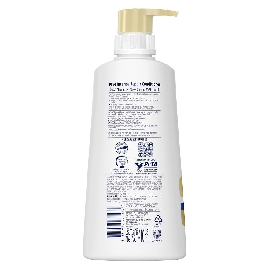 Dove Intense Repair with Keratin Repair Actives. Works immediately to repair the hair surface while deeply nourishing the core of your hair to help reconstruct it from within and make it fortified/healthy in the long run. Every time you use it, your hair is repaired, strong and beautiful. Dove Intense Repair Conditioner with Keratin Repair Actives. Works immediately to repair the hair surface while deeply nourishing the core of your hair to help reconstruct it from within and make it fortified/healthy in the long run. Every time you use it, your hair is repaired, strong and beautiful. Apply throug wet hair, focus on mid length to ends and rinse.