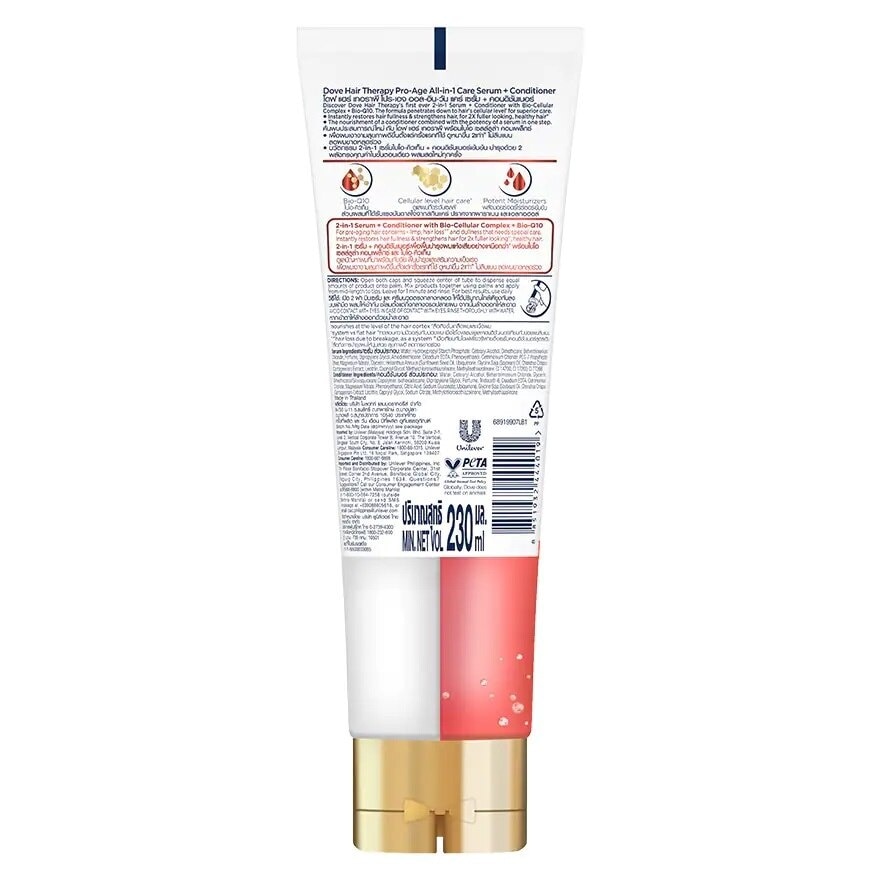 Dove Hair Therapy Serum + Conditioner Pro-Age All-in-1 Care Discover Dove Hair Therapy's first ever 2-in-1 Serum + Conditioner with Bio-Cellular Complex BioQ10. The formula penetrates down to hair's cellular level' for superior care. — Instantly restores hair fullness amp; strengthens hair, for 2X fulller looking, healthy hair — The nourishment of a conditioner combined with the potency of a serum in one step. 2-in-1 Serum + Conditioner with Bio-Cellular Complex BioQ10 For pre-aging hair concerns — limp, hair loss++ and dullness that needs special care. Instantly restores hair fullness amp; strengthens hair for 2x fuller looking, healthy hair. nourishes at the level of the hair cortex system vs flat hair hair loss due to breakage, as a system.