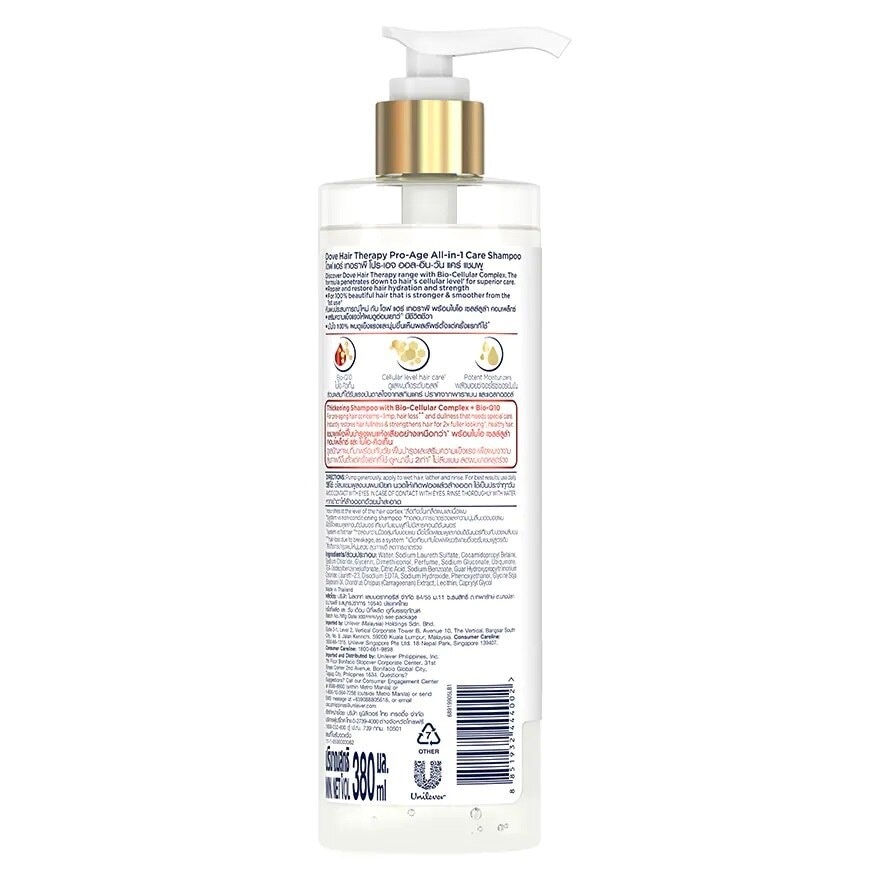 Dove Hair Therapy Shampoo Pro-Age All-in-1 Care Discover Dove Hair Therapy range with Bio-Cellular Complex. The formula penetrates down to hair's cellular level' for superior care. — Repair and restore hair hydration and strength — For 100 beautiful hair that is stronger amp; smoother hair from the 1st use Thickening Shampoo with Bio-Cellular Complex BioQ10 For pre-aging hair concerns — limp, hair loss and dullness that needs special care. Instantly restores hair fullness amp; strengthens hair for 2x fuller looking, healthy hair. nourishes at the level of the hair cortex system vs non-conditioning shampoo system vs flat hair hair loss due to breakage, as a system.