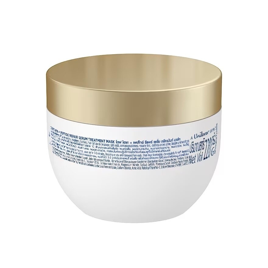 Dove Hya + Peptide Repair Serum Treatment Mask. — 10 Signs of Damage repaired in just one use — Peptide repairs hair — Amino acid nourishes hair — Hyaluronic acid hydrates hair 10 signs of damaged hair are dryness roughness frizziness hair-fall due to breakage split ends unmanageableness volume loss dullness or less shine tangles and weakness tested in laboratory compared with non-conditioning shampoo. Directions Apply to wet hair from mid-length to ends. Leave on for 3-5 minutes, focusing on dry and damaged hair ends. Then rinse thoroughly. Use regularly for soft, beautiful, strong hair. NEW Dove Hya + Peptide Repair Serum Treatment Mask. 10 Signs of Damage repaired in just one use Peptide repairs hair Amino acid nourishes hair Hyaluronic acid hydrates hair