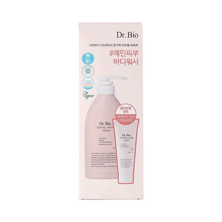 Dr.Bio Eco All-In-One Cleanser Special Set All-in-one cleanser that can be used from head to toe, Low-irritating, Leaves skin feeling moisturized but not tight after washing or showering, Helps restore skin’s optimal pH and fragrance-free formula is hypoallergenic , For daily use to gently clean, hydrate and soothe sensitive skin. The natural component in Dr.Bio ECO All-in-one Cleanser helps sooth irritated skin and has a mild cleansing effect by made the moisturizing ingredients and mixing ingredients derived from birch and beech to keep your skin moist after cleansing.