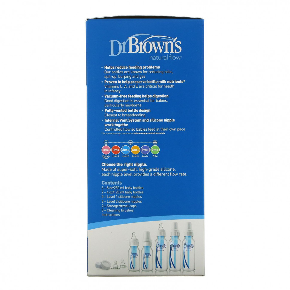 Университетское исследование было направлено на измерение уровней питательных веществ в грудном молоке и смесях для кормления из бутылочки. Было установлено, что полностью вентилируемые бутылочки от Dr. Brown’s® помогают сохранить необходимые уровни важных питательных веществ. Система вентиляции снижает окисление молока пузырьками воздуха, питательные вещества в составе которого очень легко теряются.