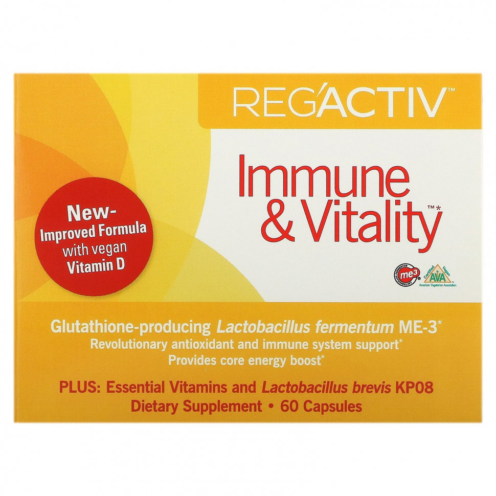 Добавка от Reg’Activ Immune & Vitalityсочетает в себе лактобактерии ферментум (Lactobacillus fermentum) штамма ME-3 с широко известными ингредиентами, повышающими уровень энергии и иммунитет, что обеспечивает их взаимно дополняющее положительное воздействие на здоровье.